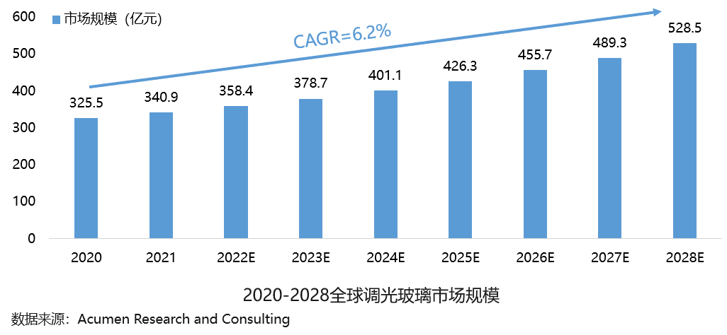 調光玻璃的全球市場規模逐年增長、潛力較大。