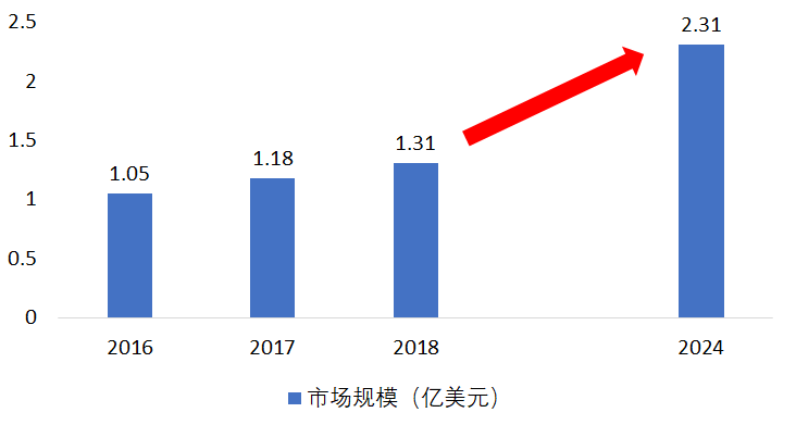 消費(fèi)電子領(lǐng)域是半導(dǎo)體熱電器件的重要實(shí)際應(yīng)用方向。2016年至2018年,半導(dǎo)體熱電器件在消費(fèi)電子產(chǎn)品應(yīng)用領(lǐng)域的銷售市場(chǎng)規(guī)模分別為1.05億美元、1.18億美元、1.31億美元,預(yù)計(jì)2024年將達(dá)到2.31億美元。