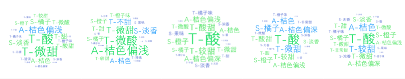 將生情、初熟(30%轉(zhuǎn)色)、中熟(70%轉(zhuǎn)色)、成熟和過熟這五個(gè)不同成熟度的桔油進(jìn)行感官測(cè)評(píng),消費(fèi)者用于評(píng)論不同成熟度樣品的描述詞主要分成程度描述(如濃、淡等)和特征描述。其中特征描述包括顏色(桔色)、香氣(橘子、橙子、柚子、果味)和口感(酸、甜以及異味)。進(jìn)一步比較不同成熟度的樣品描述詞出現(xiàn)頻率的差異,繪制每個(gè)樣品的詞云:結(jié)果發(fā)現(xiàn)樣品略有差異,均具有橘子味、甜味、酸味的特征;不同成熟度的汽水顏色有差別,被消費(fèi)者形容為桔色、桔色偏淺、桔色偏深。