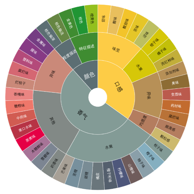 請(qǐng)200名消費(fèi)者對(duì)北冰洋桔汁汽水中能感知到的口感、顏色和香氣的描述詞進(jìn)行列舉,來形成北冰洋桔汁汽水的風(fēng)味輪盤,表征產(chǎn)品的感官特性。口感的描述詞主要分為甜度、酸度、酸甜及其他味,另外有一些特殊味如苦味、澀味、臭味、添加劑味、藥材味等可能在一定程度上幫助分辨汽水的質(zhì)量問題。香氣有從無香到濃香,還有一些其他描述詞如奶香、檸檬香、橙子香、柚子香、芒果香等等。而顏色的描述詞主要是淡、中、深三個(gè)層次。