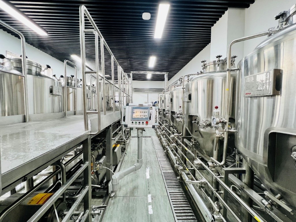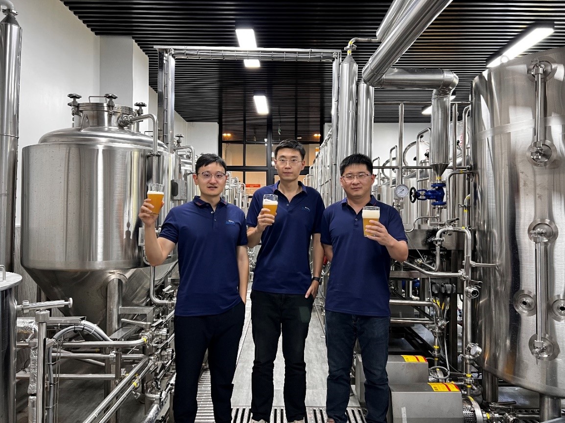 初期,研發團隊堅持高強度學習,并先后赴十余家啤酒設備廠、研究機構實地考察學習,高效率高質量建成了中試車間,打造了一條可進行連續投料、鍋槽互通的300L自動化糖化釀造生產線,可實現煮出糖化、降溫回旋等特殊工序,同時配備易拉罐自動灌裝線、keg桶灌裝線等專業裝置,為配方開發及工藝優化打下了堅實的基礎。